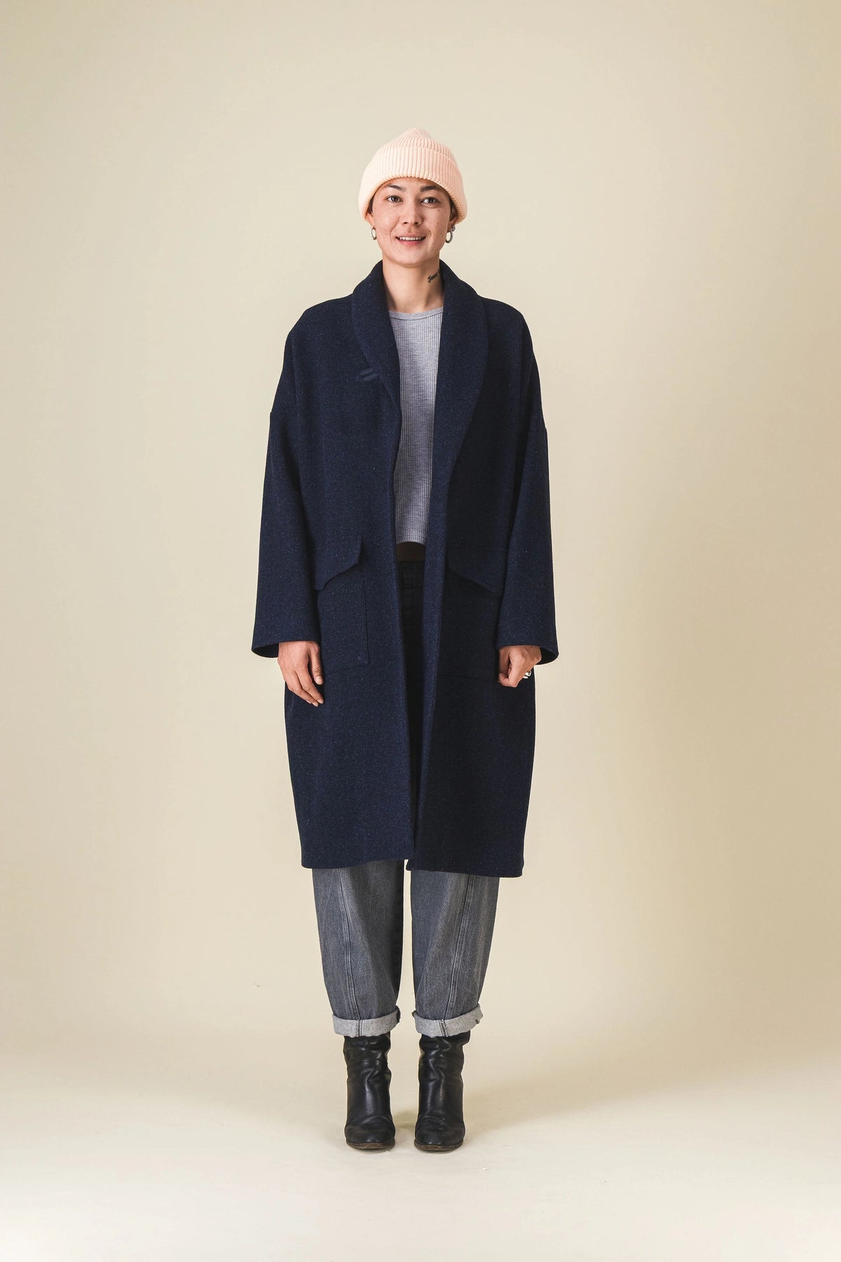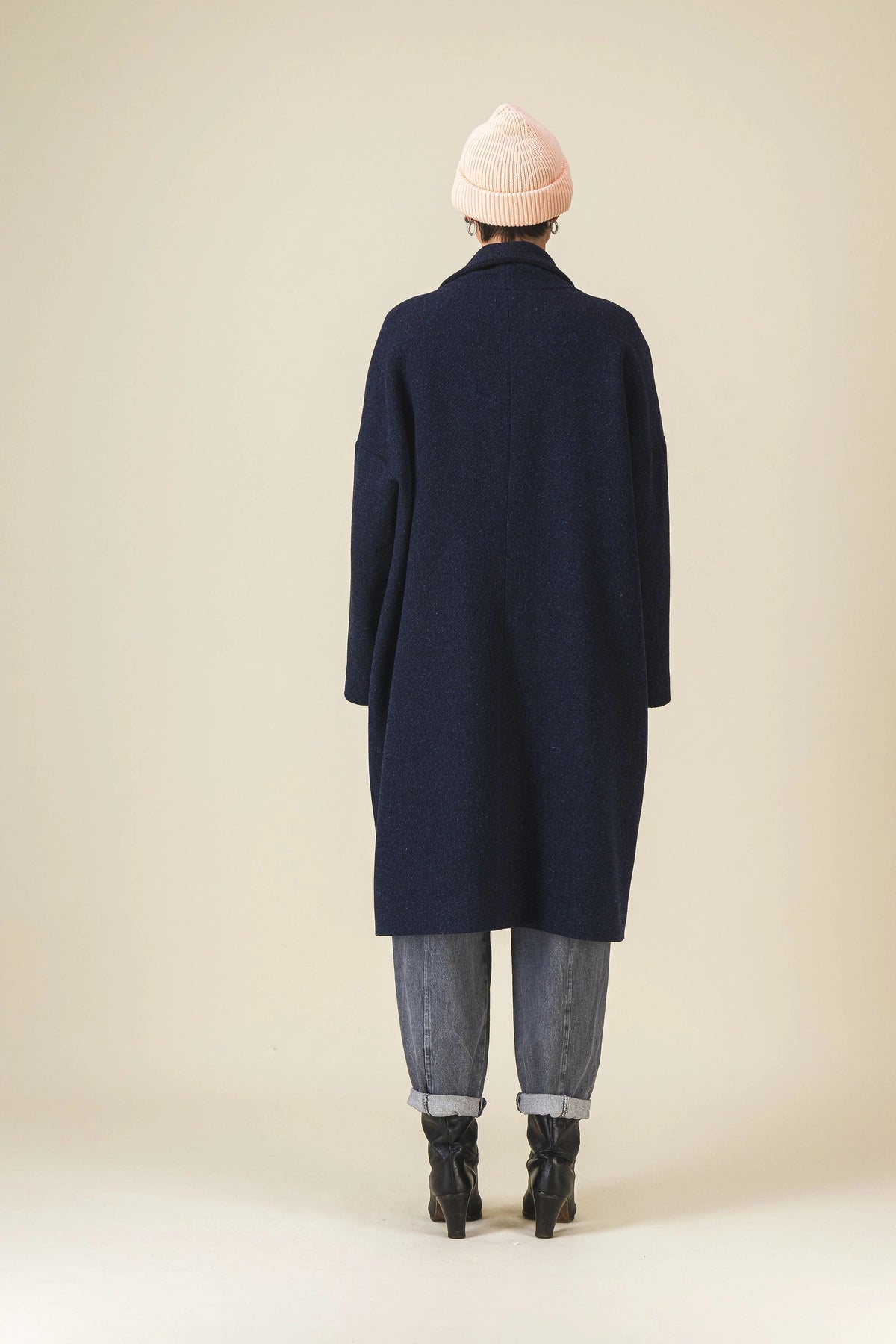 Our coat that we enjoy reinventing every winter, in mottled navy fabric (like the Manille jacket).