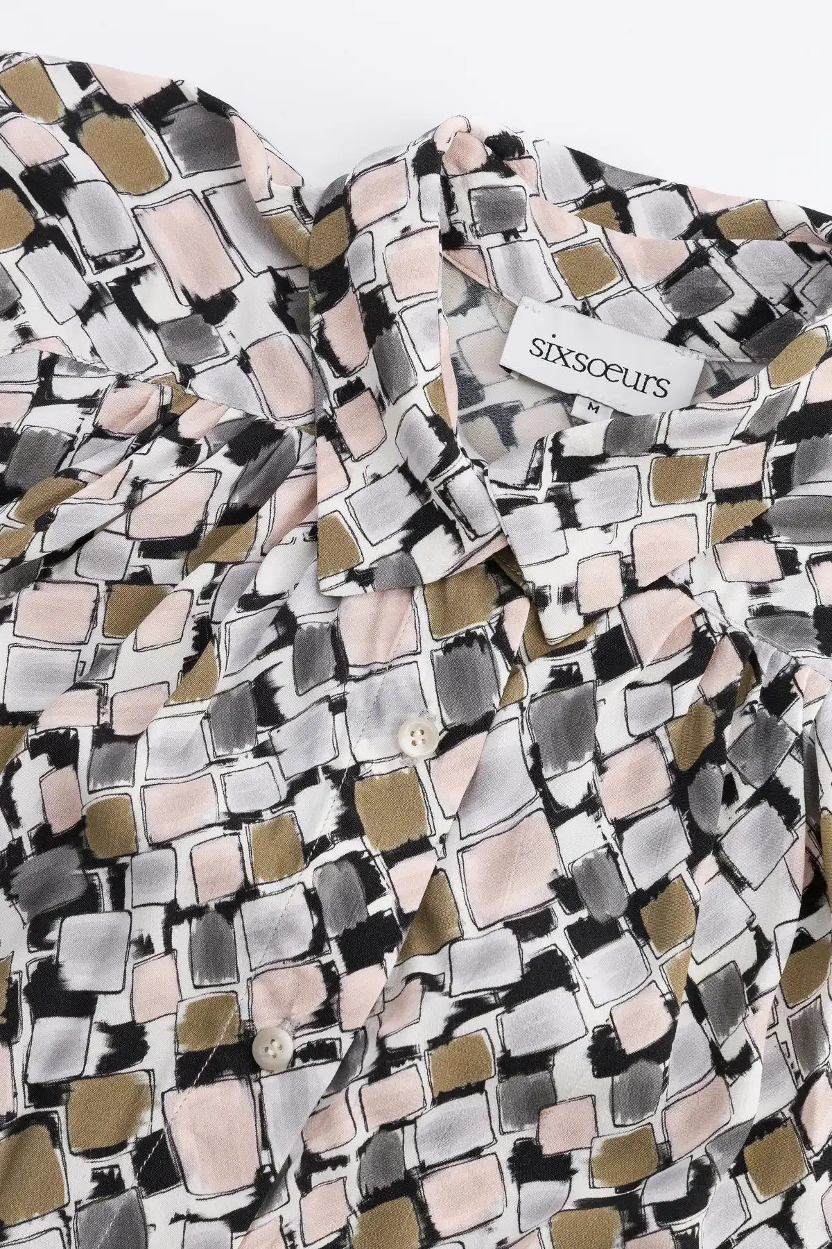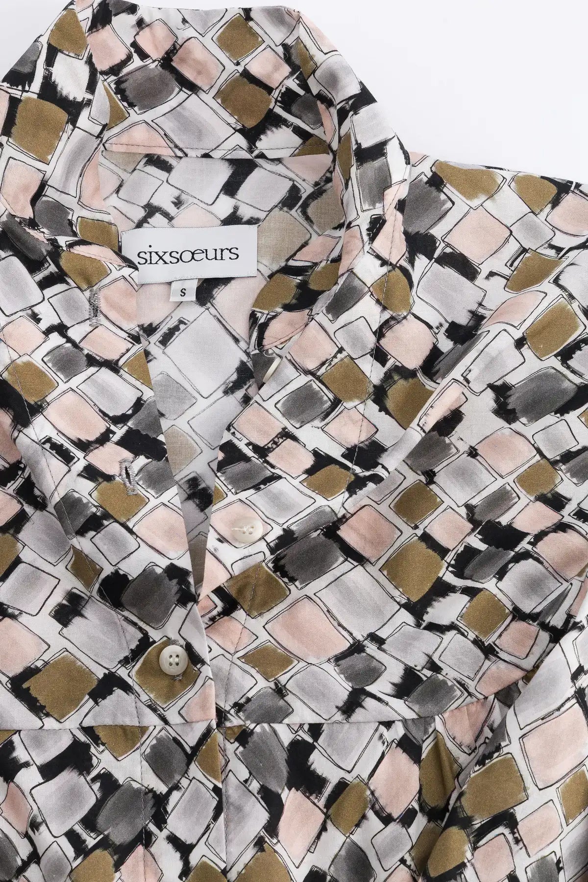 Romantic, loose-fitting blouse with a 1920s feel, buttoned at the front. Features a rounded yoke extending to mid-shoulder, a stand-up collar, small gathers at the front, and side slits. Made from exclusive printed cotton voile.