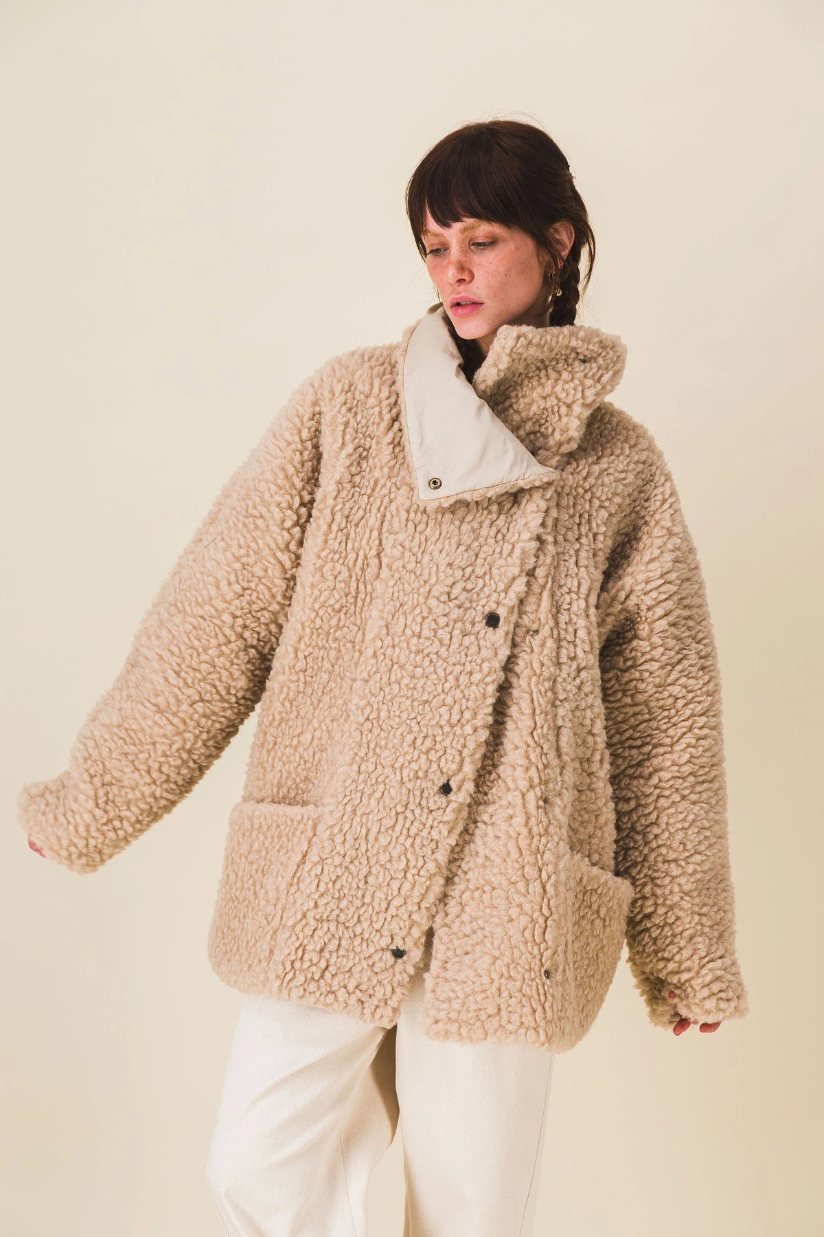Unbleached beige wool woven in Italy, lined with cotton. Very, very warm and ultra-cozy with its snap buttons and large collar that goes up very high to protect us.