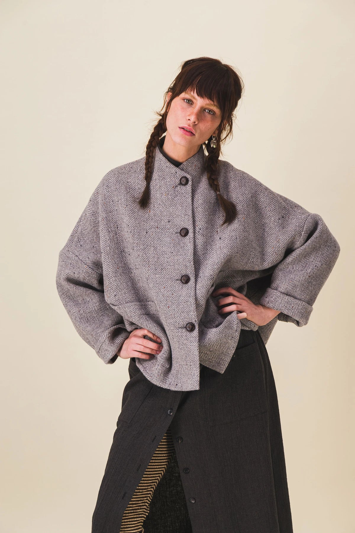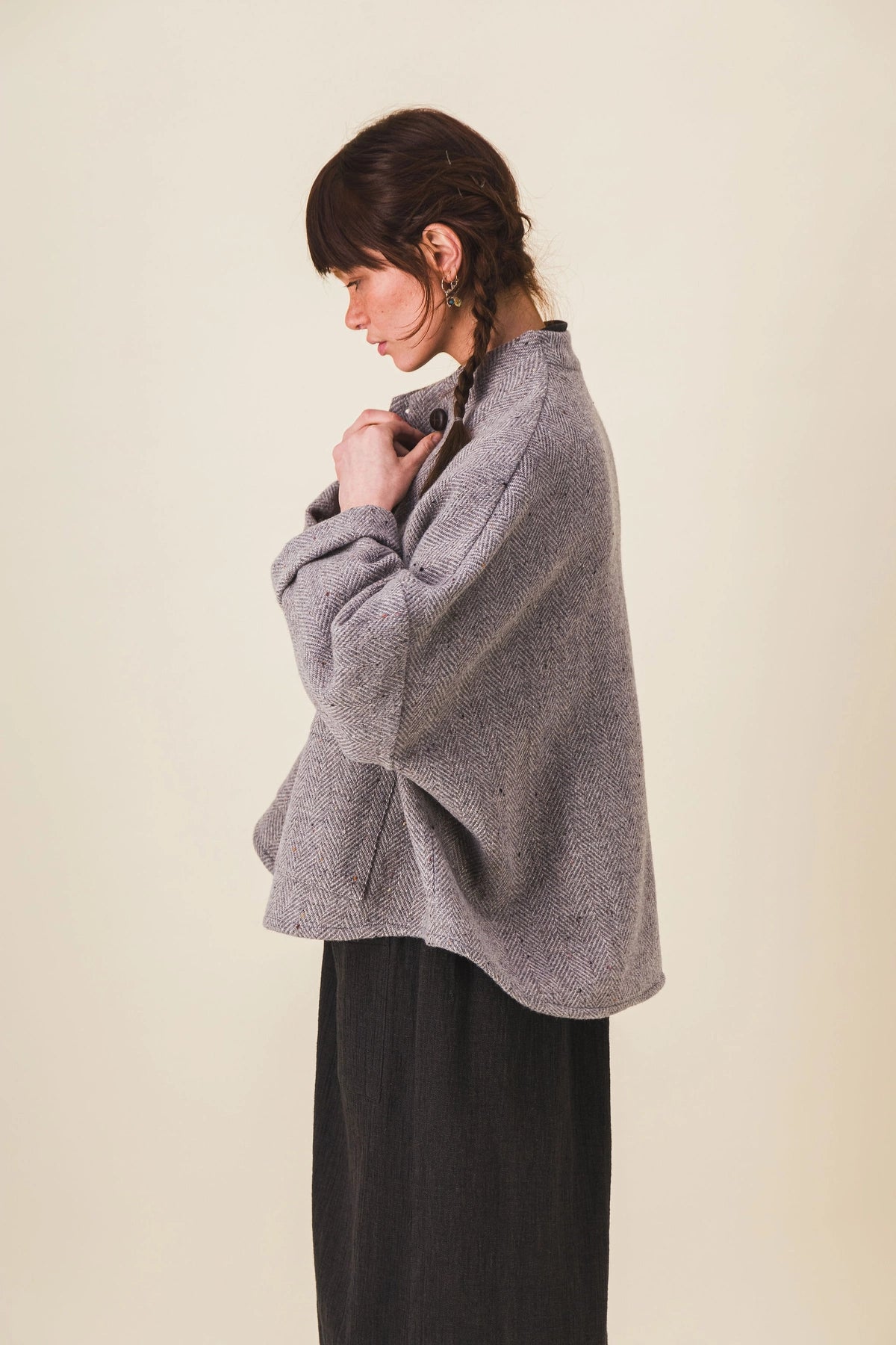 Short reddish brown wool jacket with mottled herringbone weave of dupion. Very oversized and flared shape like a small cape, low sleeves, unlined, integrated collar for a refined volume, two patch pockets, buttons made in the Jura.