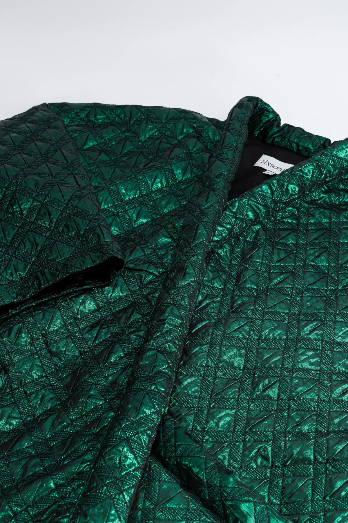 Jacquard kimono woven near Lyon, exclusive colors, metallic green with a diamond effect.
