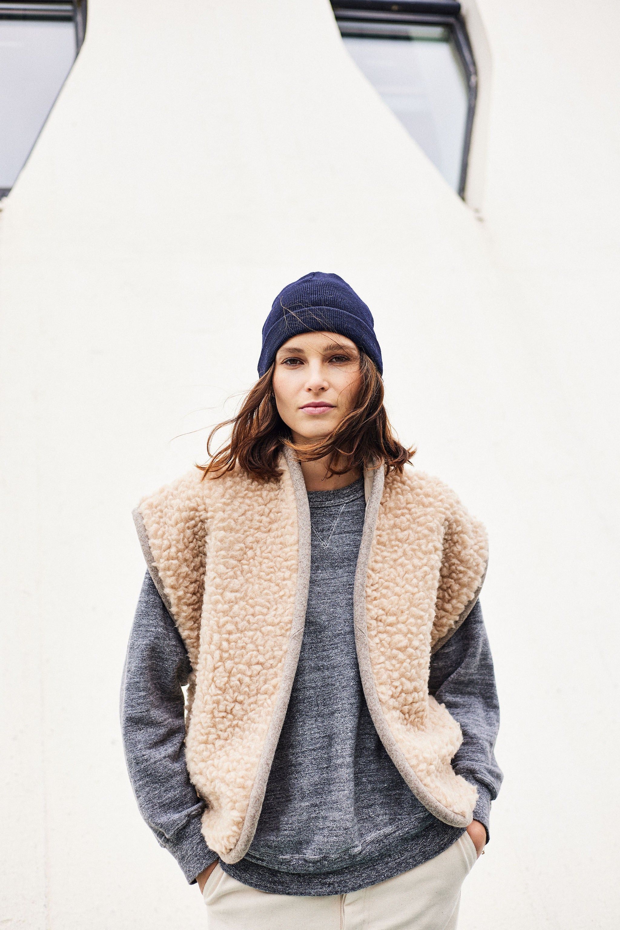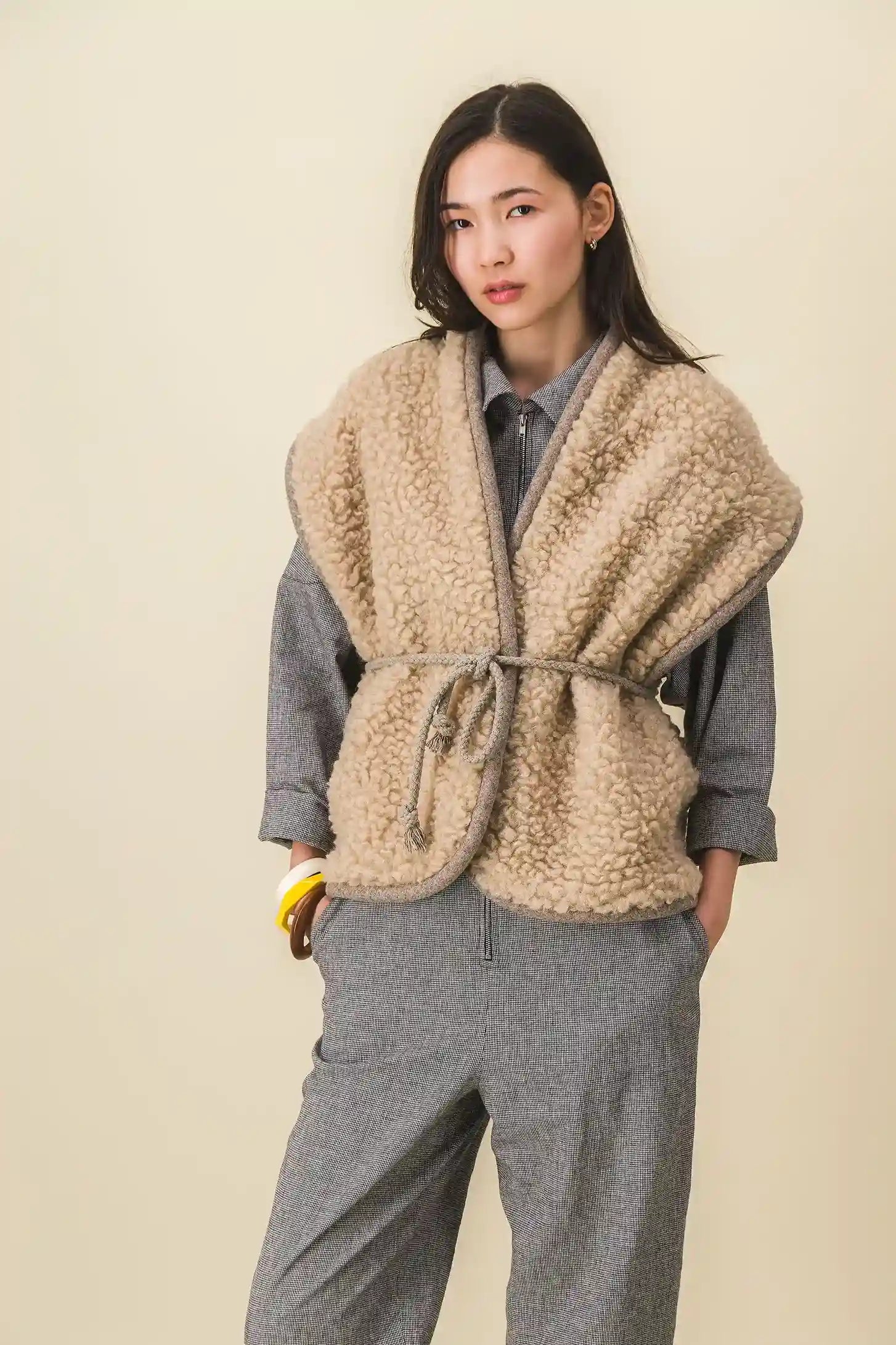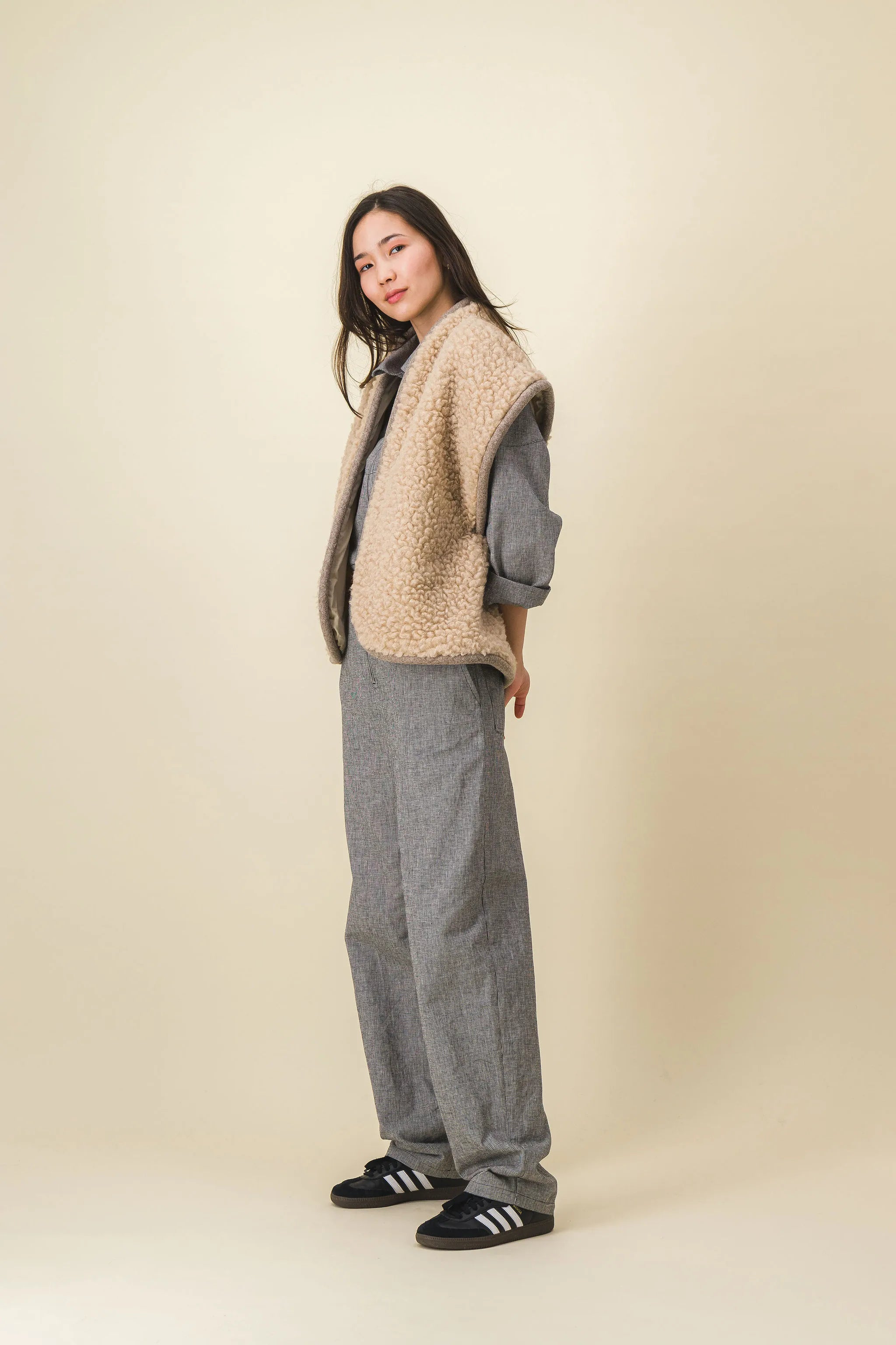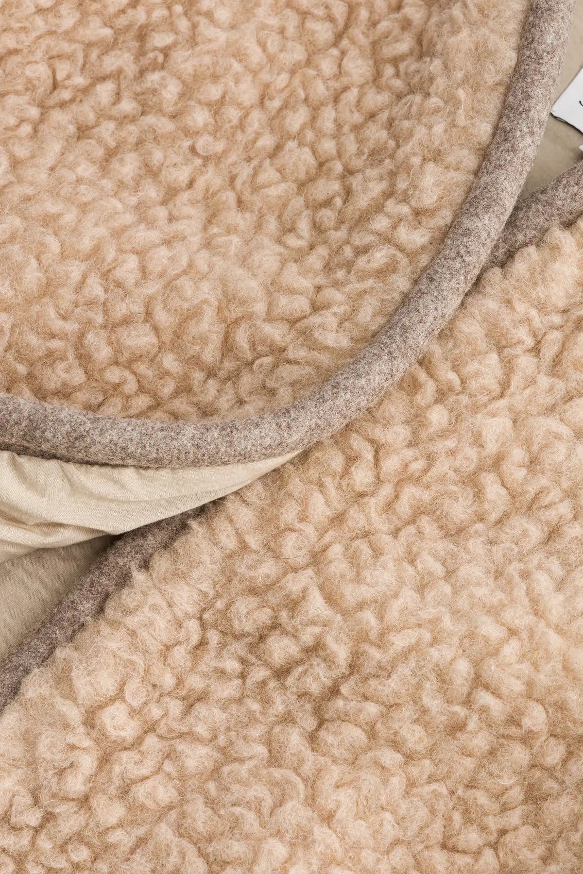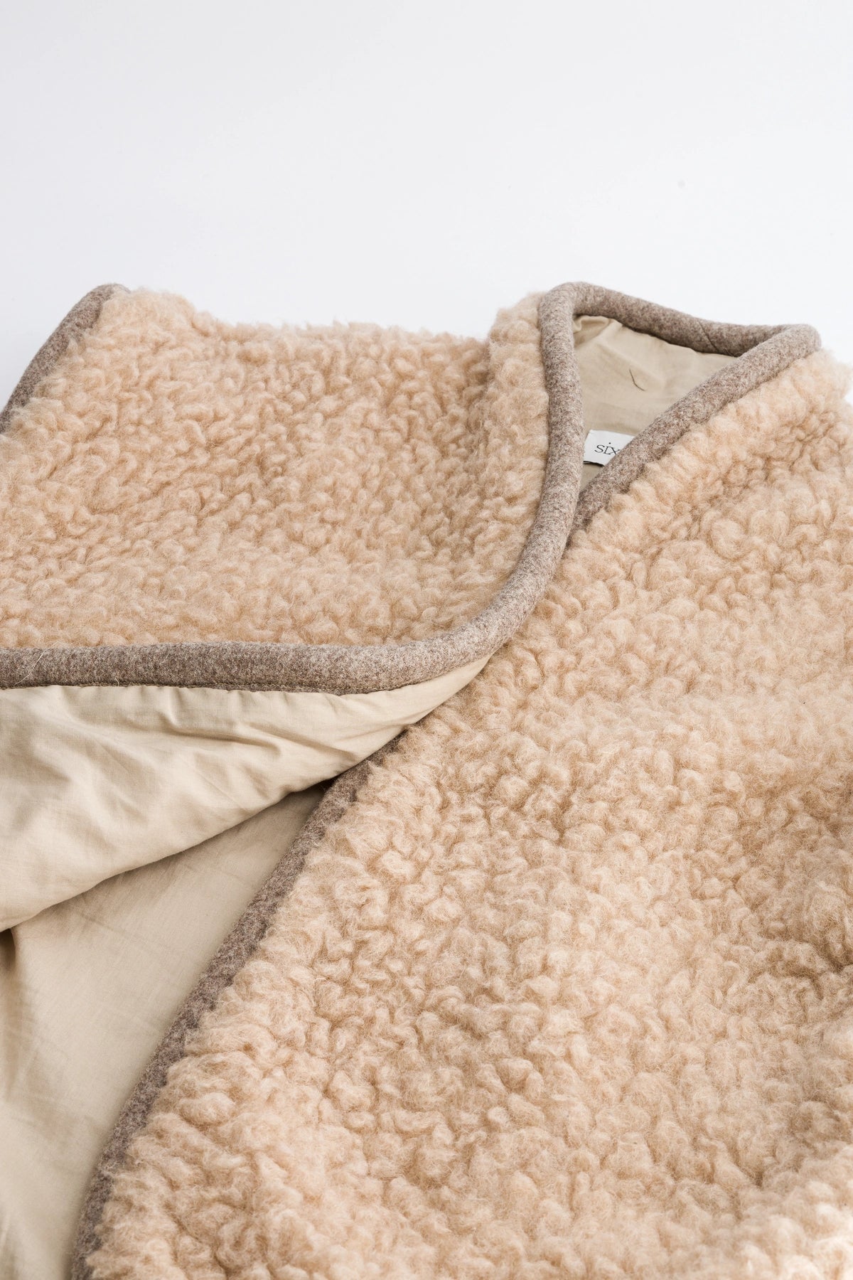 Sleeveless jacket in beige wool fleece. Edge edged with a padded braid covered with a mottled beige wool.