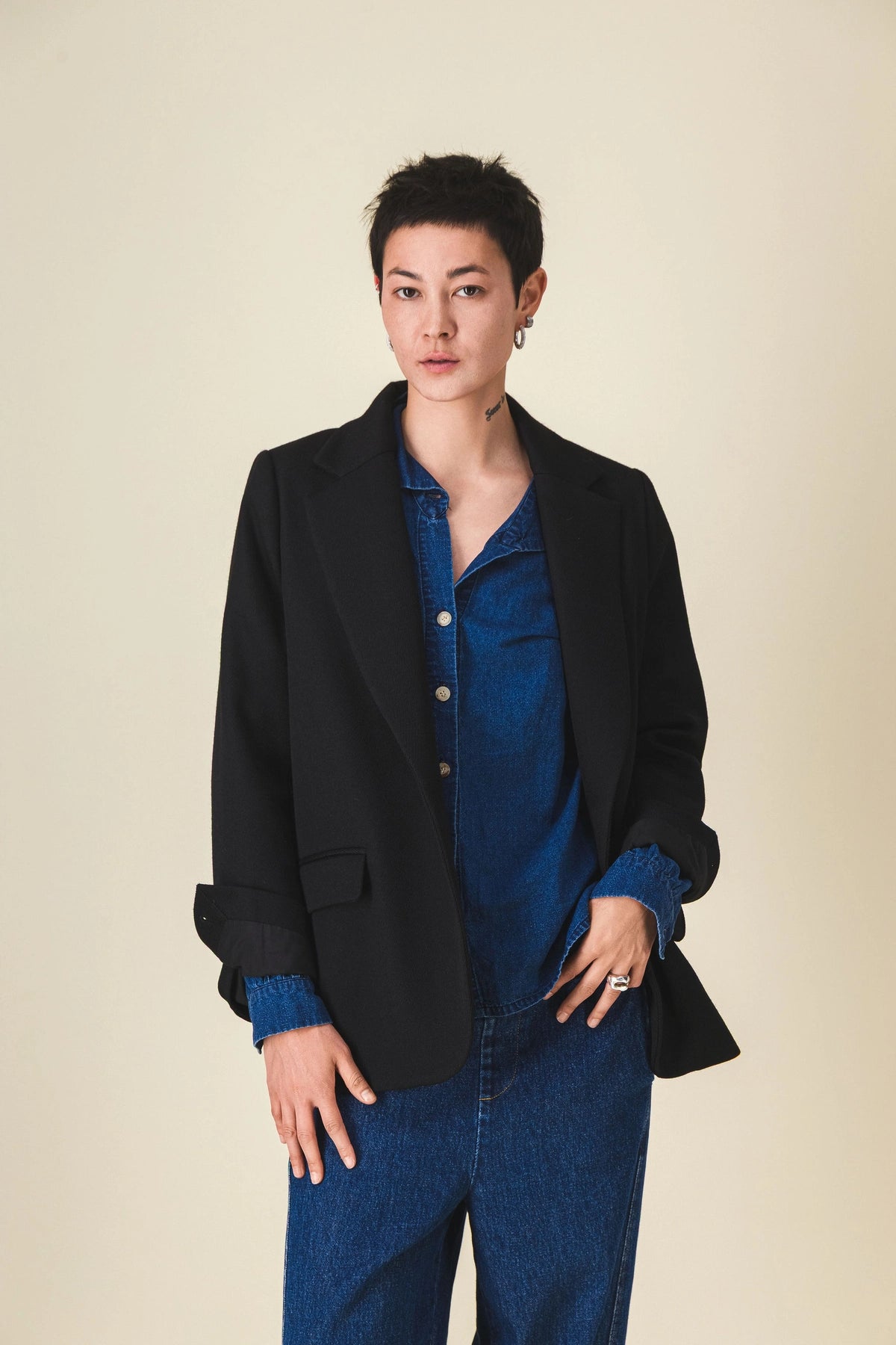 A menswear-inspired women's blazer made from black wool, it's the perfect wardrobe staple. Buttoned, with flap pockets, it's the blazer we've been waiting for.