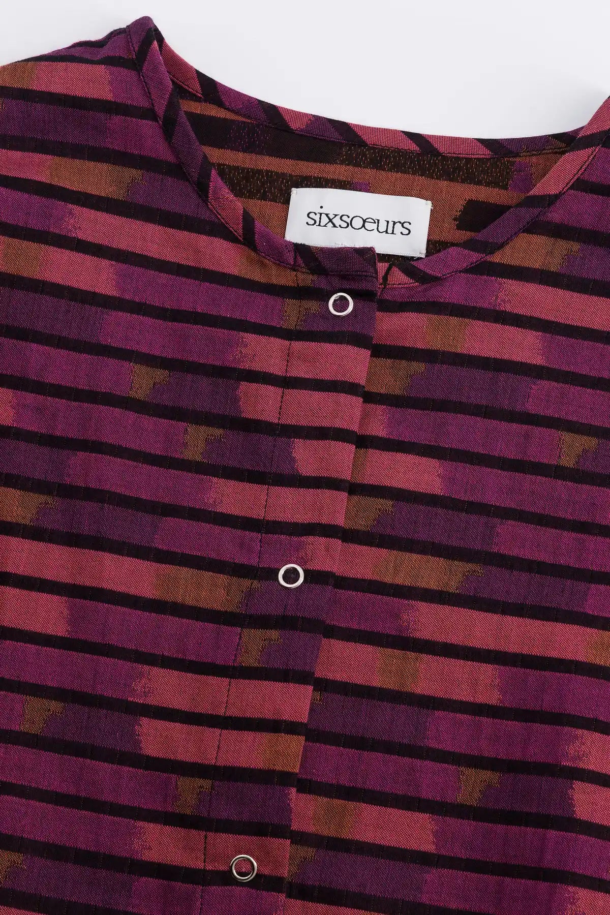Robe à la coupe structurée, resserrée par un élastique. Col montant, manches chauve‑souris soulignées par un jeu de rayures. Deux poches plaquées sur le devant. Fermeture sur toute la longueur par pressions en métal bronze. Jacquard tissé en France.