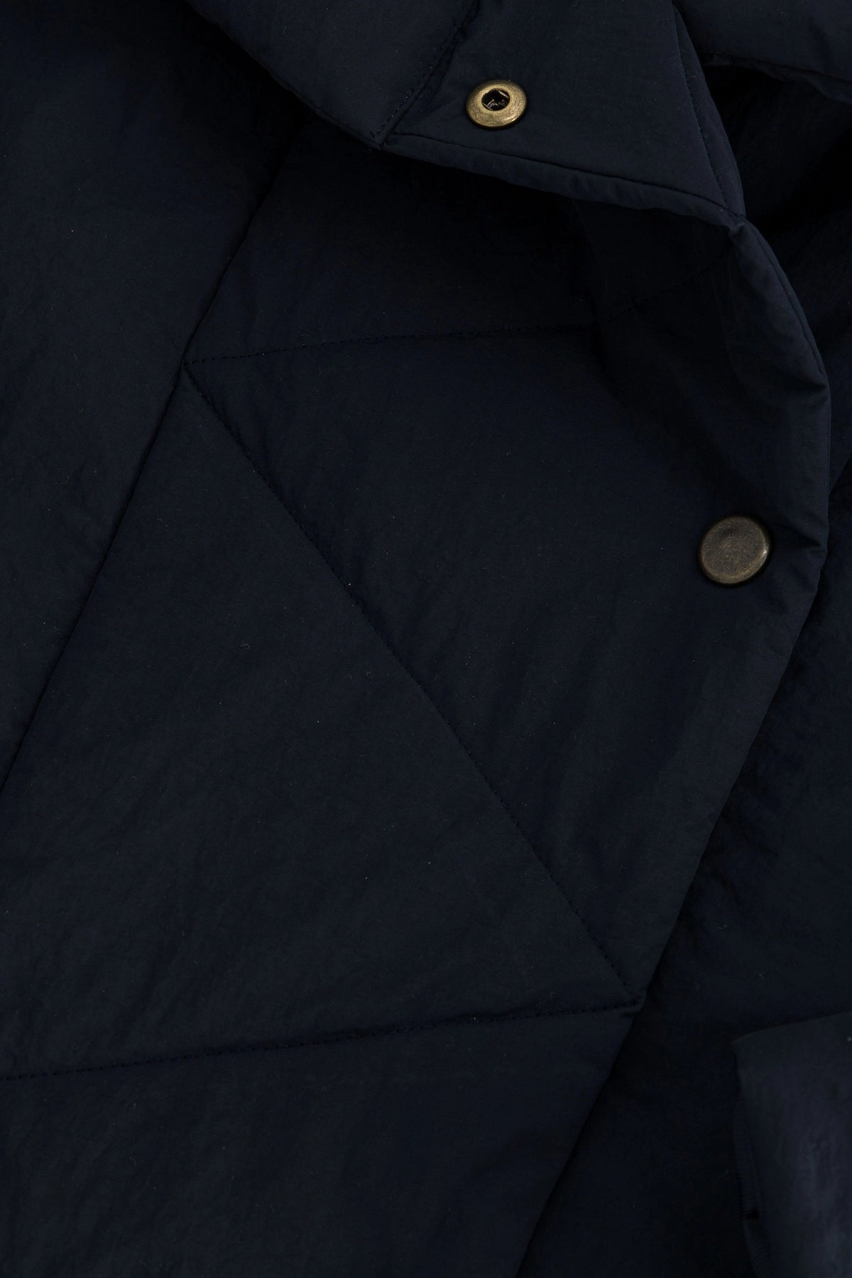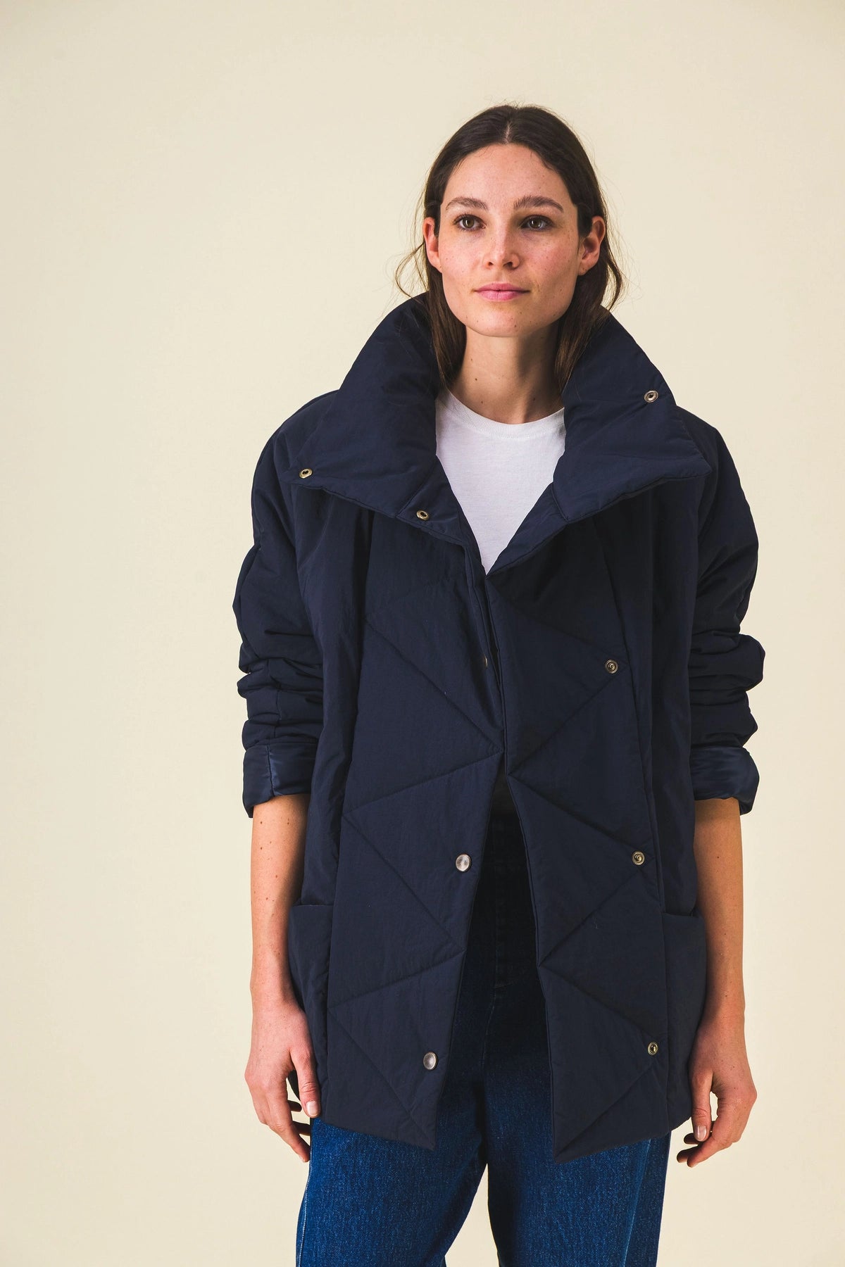 Patch pockets, batwing sleeves, and a large stand-up collar. Couture style and maximum protection against the cold. Navy blue.