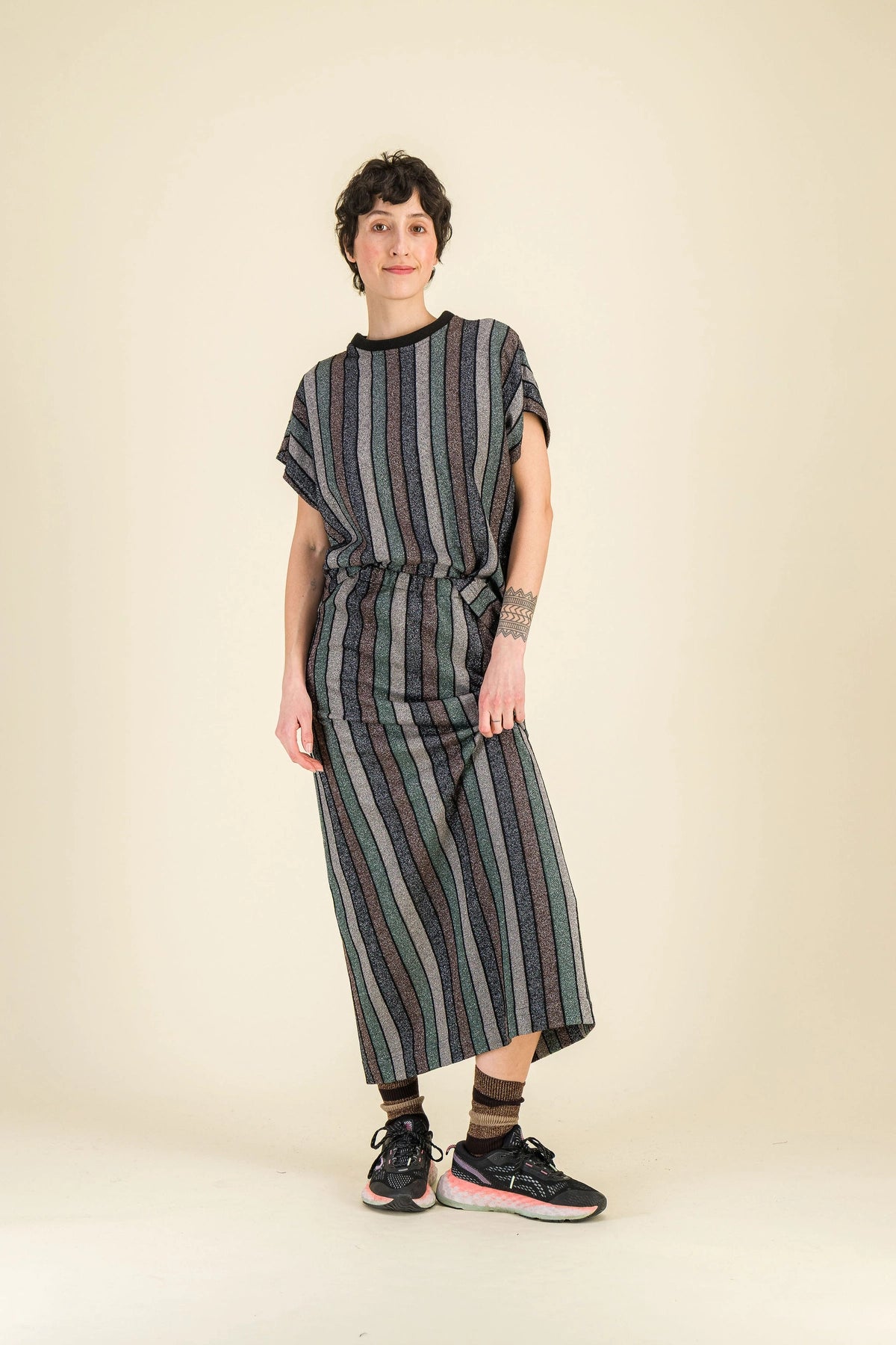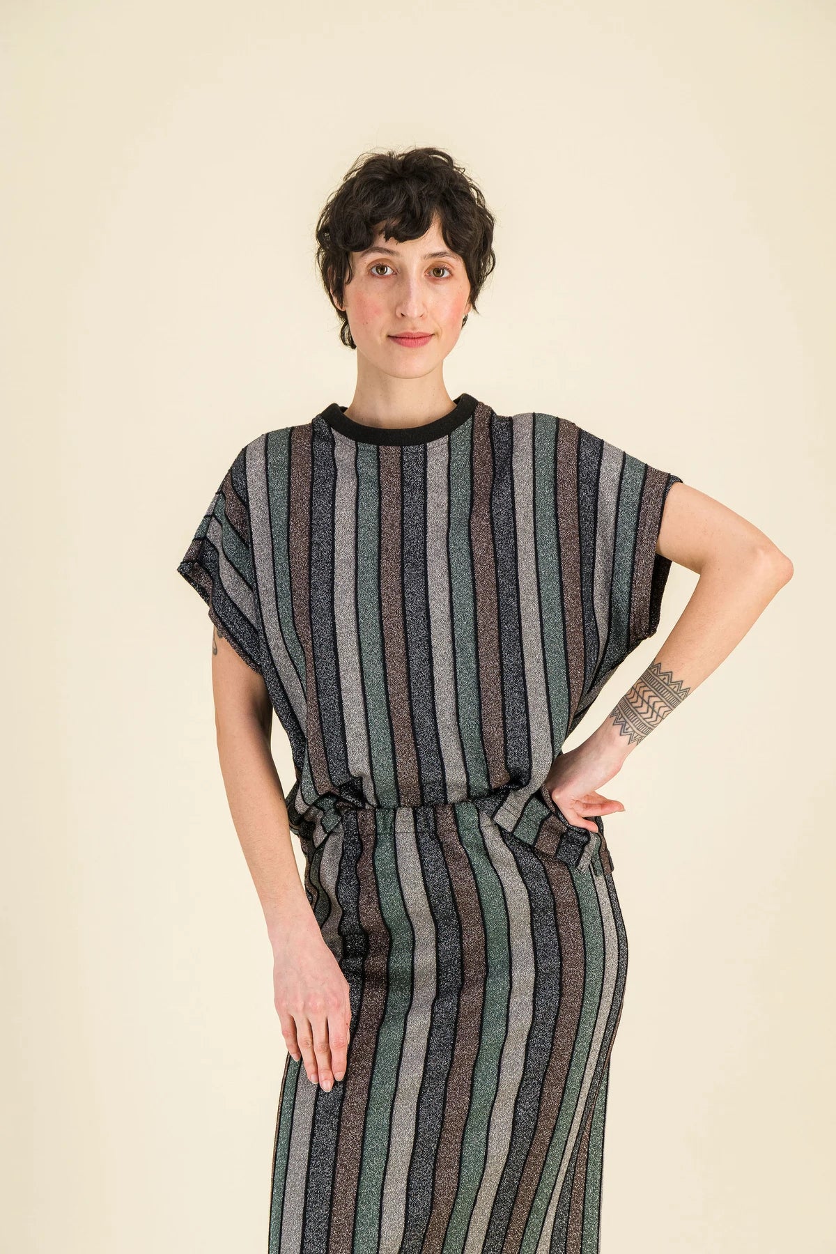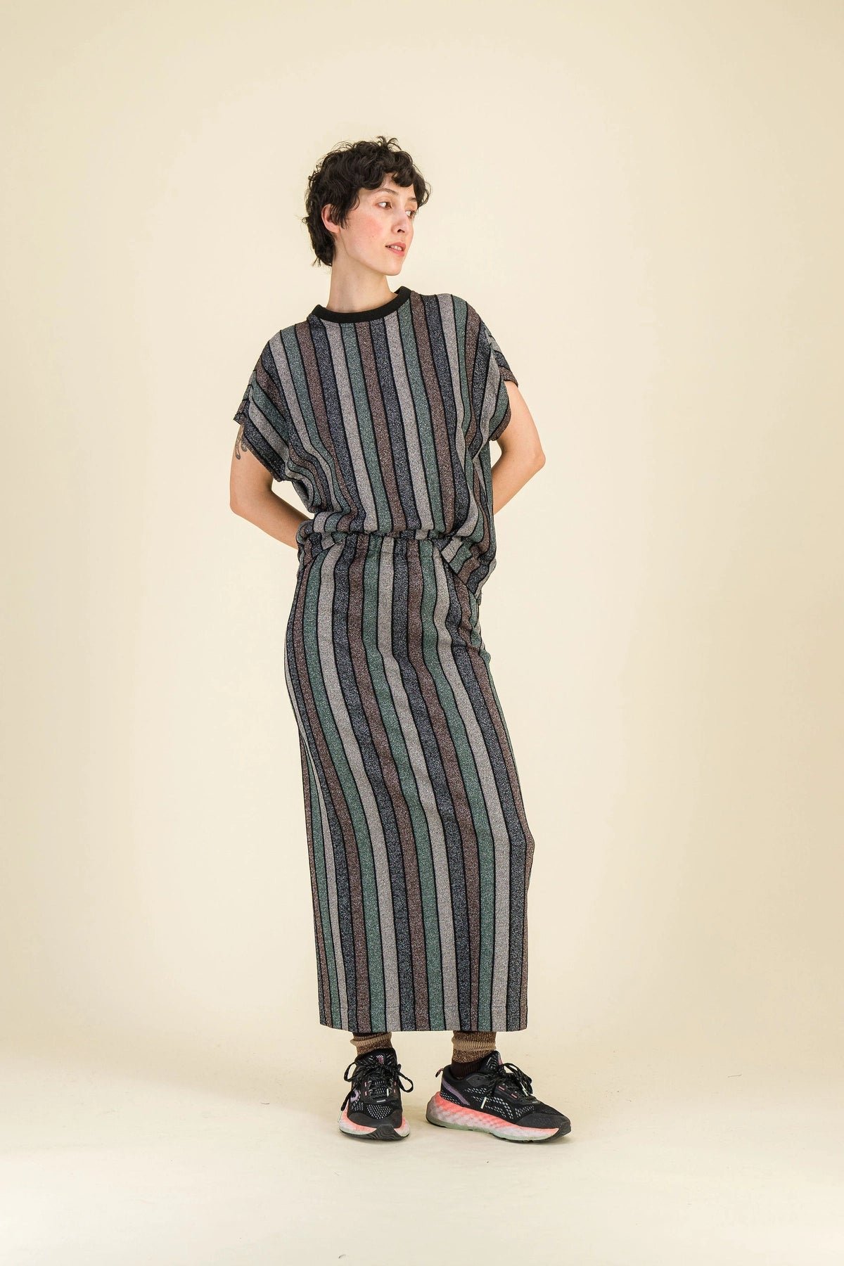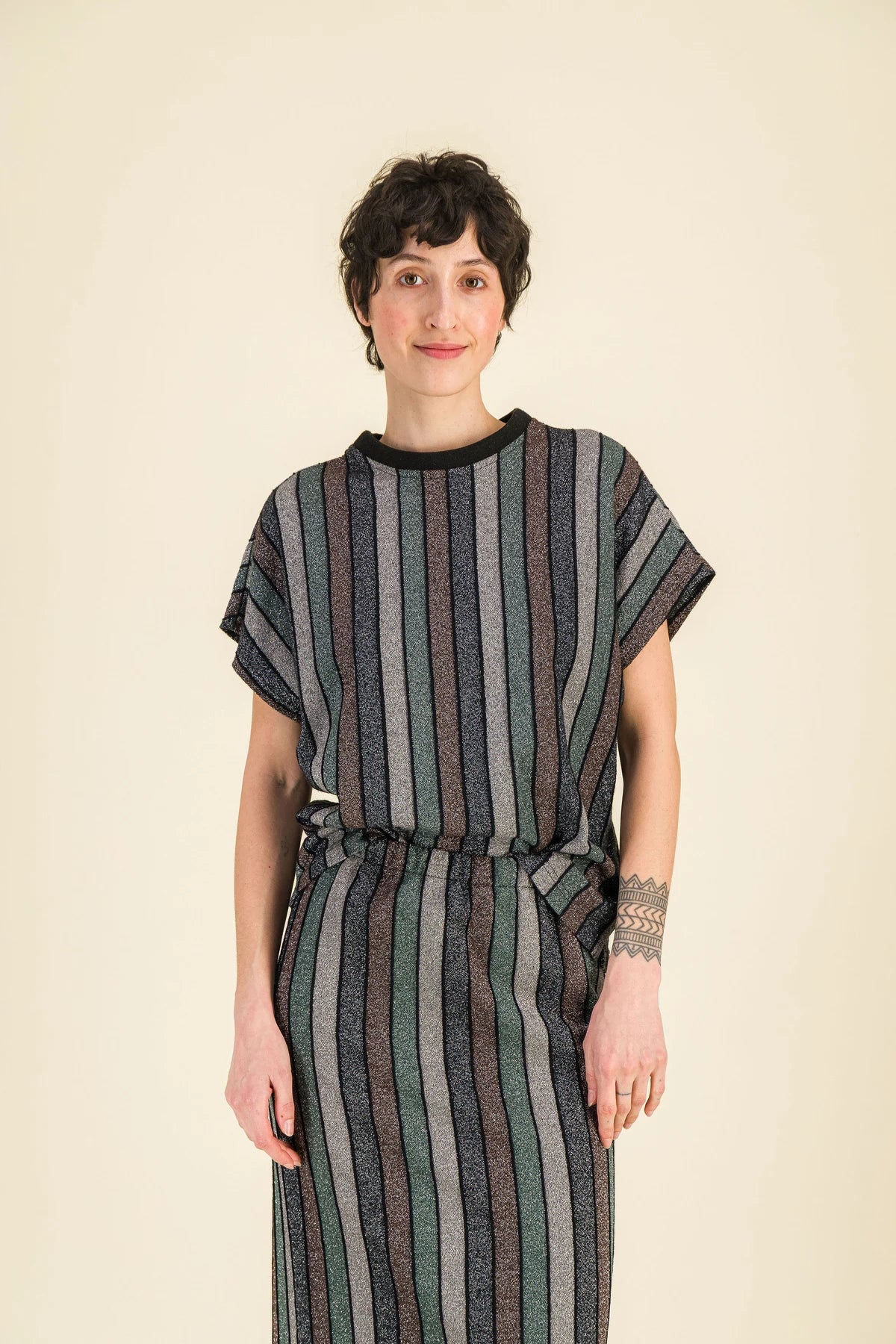 Coupe épurée, laissant le tissu s’exprimer pleinement. Col noir apportant une touche de structure. À associer à la jupe Soko pour un total look facile au quotidien.