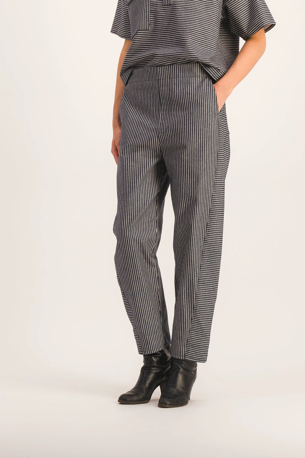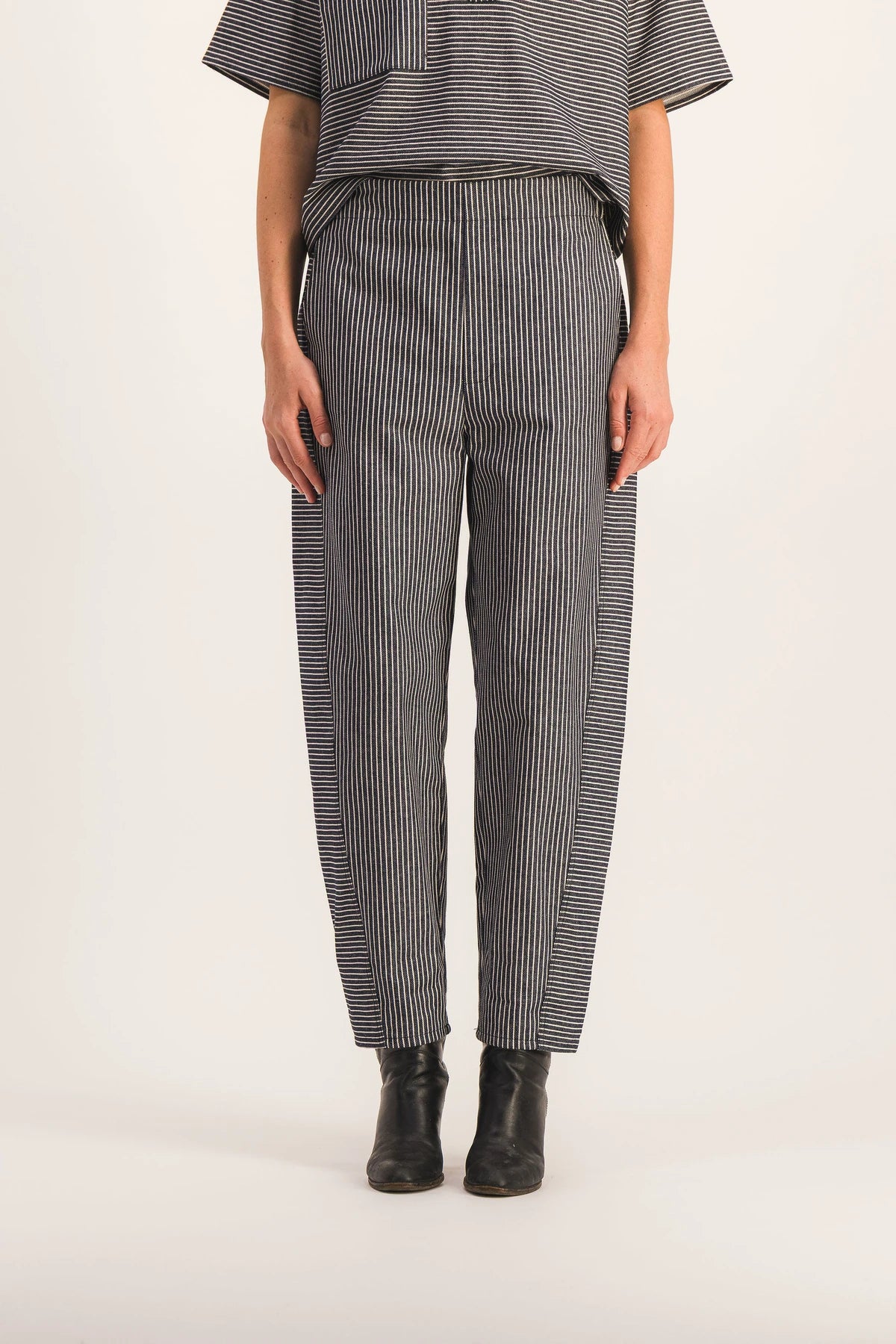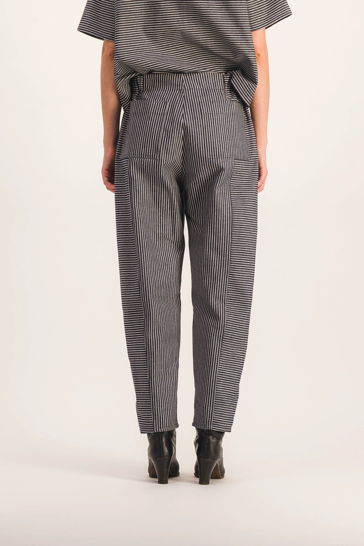 Navy ecru striped cotton trousers, barrel volume, offset side seam detail on the front of the leg, which slims the silhouette. Elasticated side waistband, patch pockets on the buttocks, Italian side pockets. Timeless French canvas. Pair with the Ernesta top for a jumpsuit effect.
