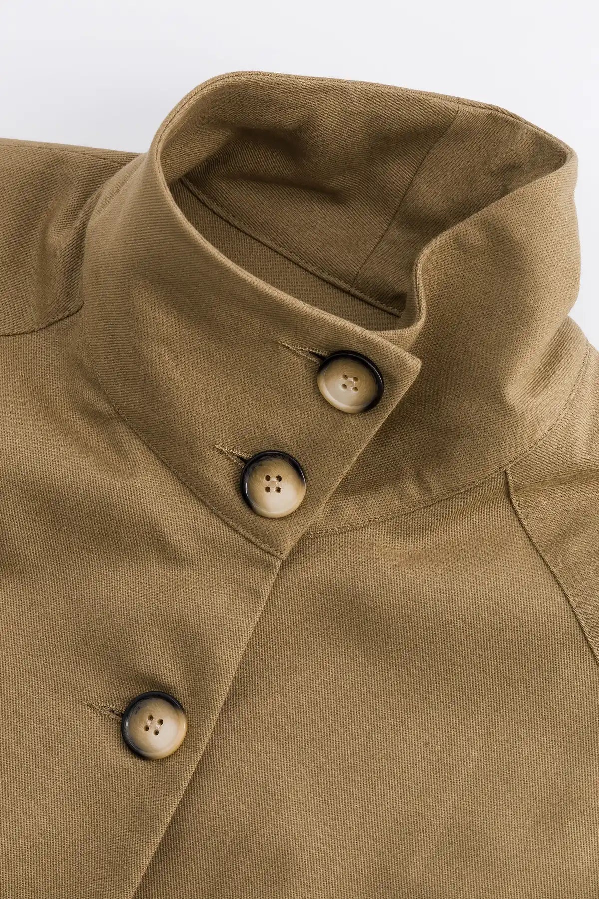 High collar, flap in the back, 2 buttoned slits at the bottom sides and 2 piped front pockets.