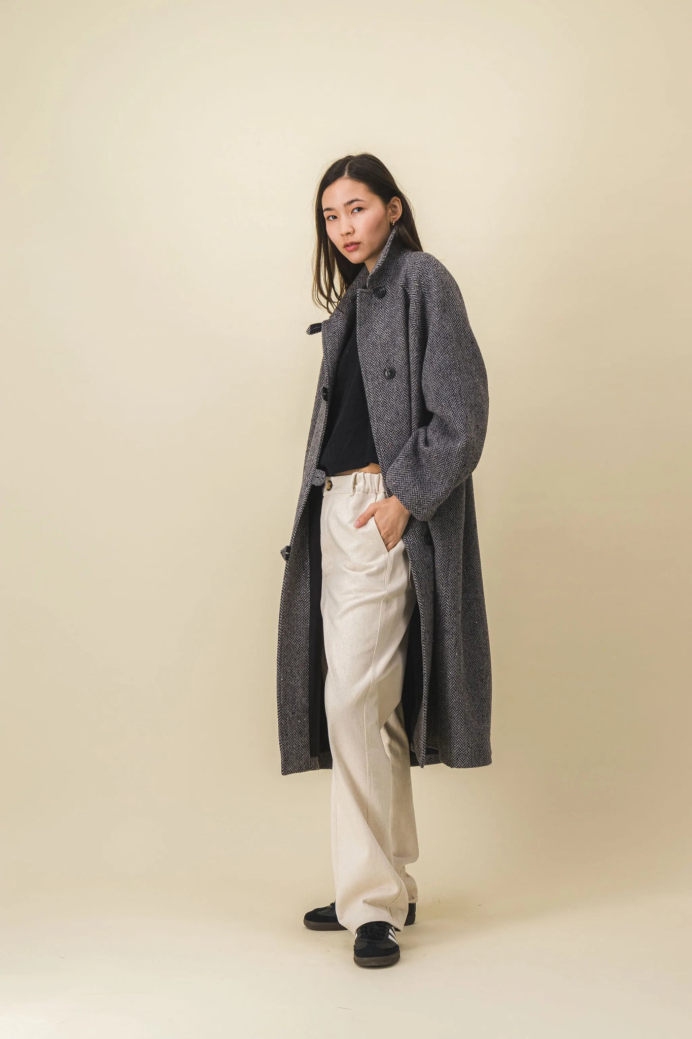 Long women's coat in grey and black mottled herringbone, pure wool woven in Italy.